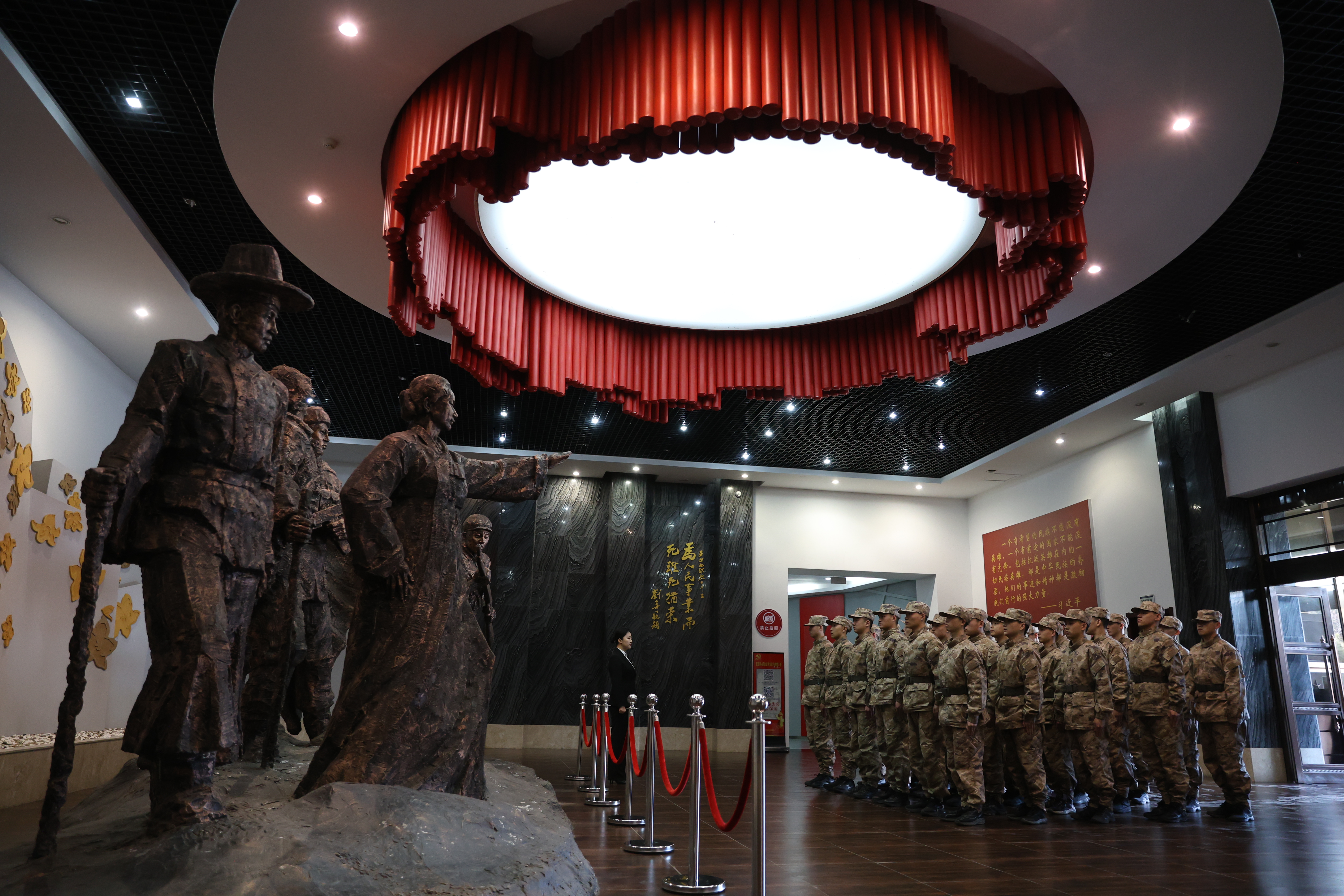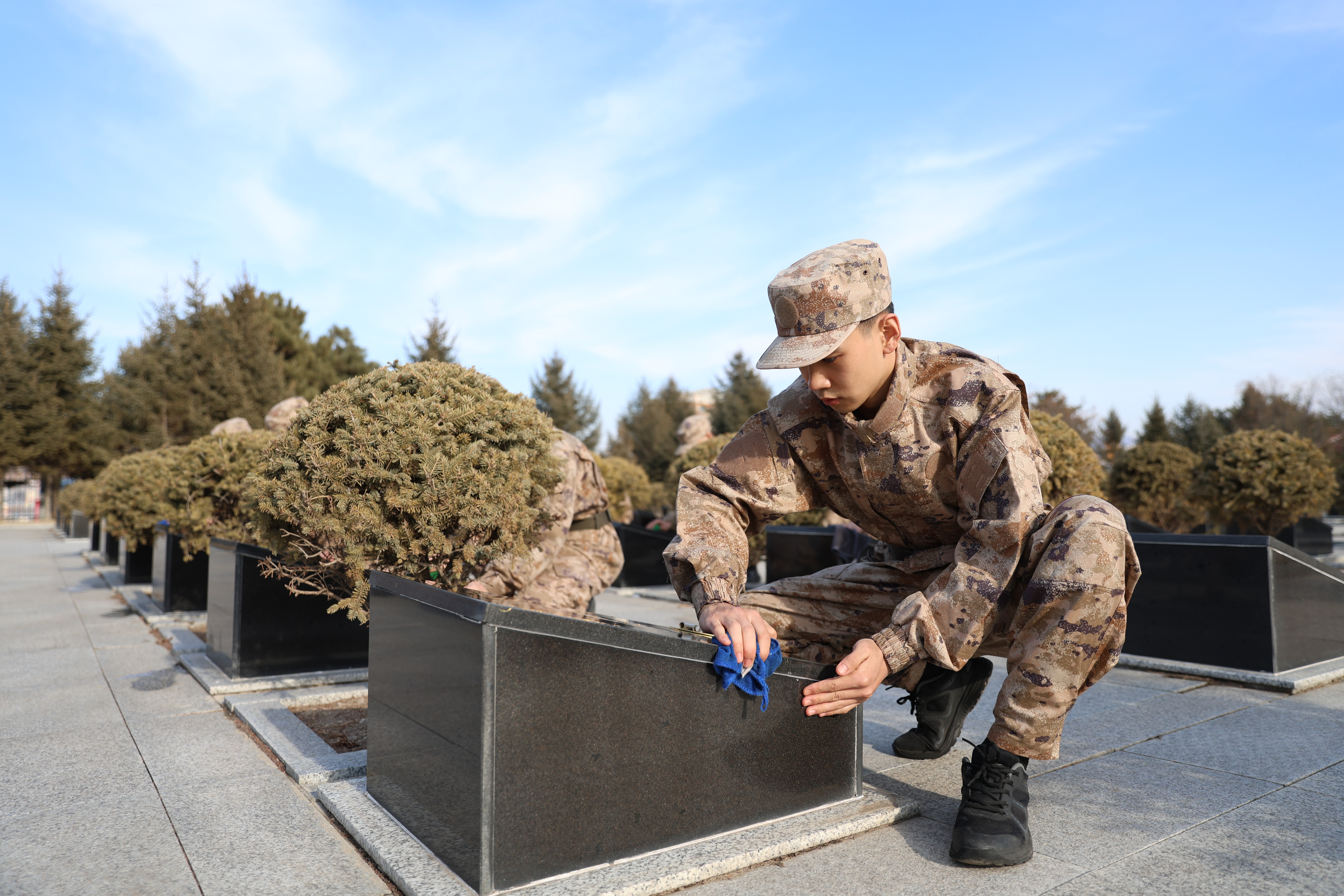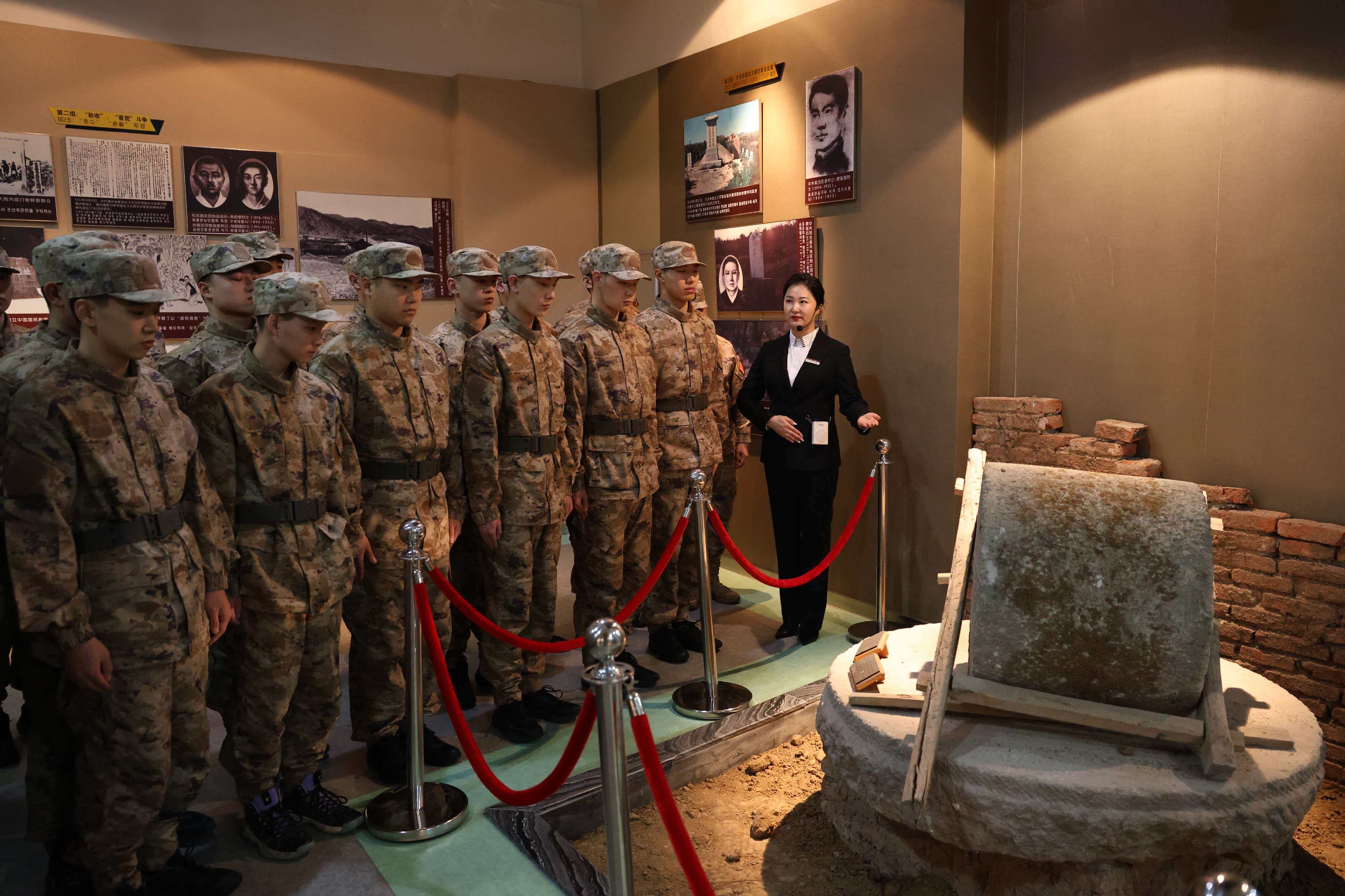在松柏苍翠、庄严肃穆的延边革命烈士陵园,新兵们整齐列队、神情庄重瞻仰烈士纪念碑,并向革命烈士默哀致敬、敬献鲜花。在烈士墓区,大家手持清洁工具,俯身擦拭每一块墓碑,细心清扫周边杂物。随后,新兵们走进延边革命纪念馆,在讲解员的引导下,依次参观馆内各个展厅,驻足观看历史图片、文献资料与实物展品,认真聆听延边儿女在抗日战争、解放战争、抗美援朝战争中浴血奋战的英雄事迹,深刻感悟“山山金达莱,村村烈士碑”的红色底蕴。