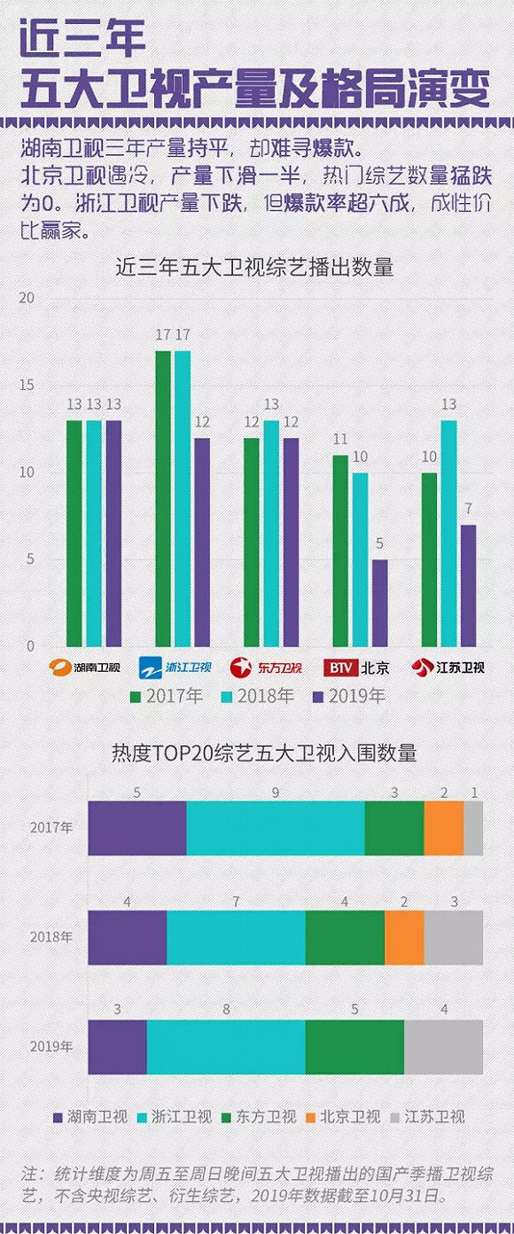 ¡¡¡¡2019ÄêÎå´óÎÀÊÓÖÜÎåÖÁÖÜÈÕÍí¼ä»Æ½ðµµ²¥³ö×ÛÒÕ¹²49µµ£¬³ýÁ˺þÄÏÎÀÊÓ²úÁ¿³ÖƽÍ⣬Õ㽡¢¶«·½¡¢½ËÕ¡¢±±¾©ÎÀÊÓ¶¼²»Í¬³Ì¶È¼õ²ú¡£ÆäÖУ¬±±¾©ÎÀÊÓÏ»¬×îÛ£¬µø·ù¹ý°ë£¬È«Äê½ö²ú³ö5µµÖÜÄ©»Æ½ðµµ×ÛÒÕ¡£Íø×Û·½Ã棬³ýÌÚѶÊÓÆµ²ú³öÓëÉÏÄê»ù±¾³ÖƽÍ⣬°®ÆæÒÕºÍÓÅ¿á¼õ²ú³¬Ëijɣ¬Ã¢¹ûTVƾ½è17µµ½ÚÄ¿½øÈëǰÈý¡£