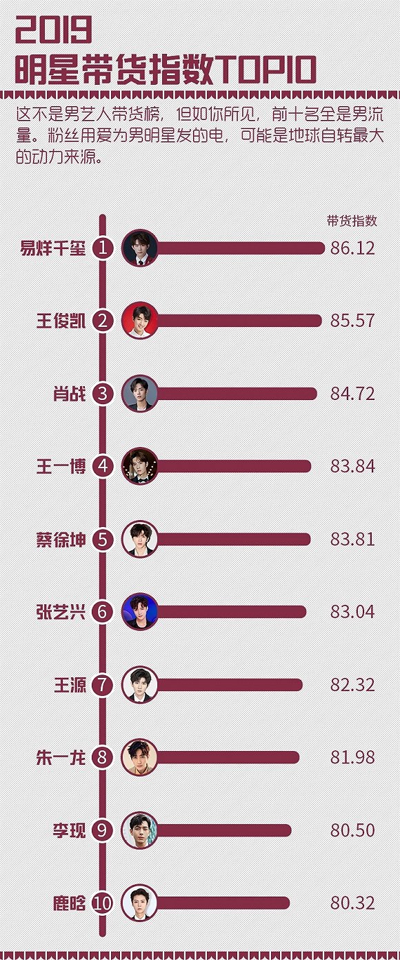 ¡¡¡¡ºÍ2018ÄêÃ÷ÐǰñÒ»ÖµÄÇãÏòÊÇ£ºÅ®Ã÷ÐǵÄÏûʧ¡£ÎÞÂÛÊÇÉÌÒµ¼ÛÖµ»¹ÊÇÈȶȣ¬Å®Ã÷ÐÇÈ«Ãæ²»µÐÄÐÐÇ£¬´ø»õÖ¸Êý°ñµÄTOP10ÎÞÒ»ÀýÍâÈ«ÊÇÄÐÐÇ¡£´ËÍ⣬2019ÄêÉ罻ƽ̨ºÍ¶ÌÊÓÆµÆ½Ì¨ÔÚ“ËØÈËÁìÓò”µÄÔìÐÇÄÜÁ¦£¬ÆäÖбíÏÖ×îΪͻ³öµÄÊÇÁõÓîÄþºÍÀî¼Ñçù£¬Ç°Õ߯ð¼ÒYYÖ±²¥£¬ºóÕßÔòÊÇ´ÓÖ±²¥Æ½Ì¨×ß³öµÄ´ø»õÍøºì¡£µ«ÕýÈç°×ƤÊéÖеÄ˵Ã÷£º“ÍøºìµÄÉúÃüÁ¦È¡¾öÓÚ·ç¿ÚµÄÖÜÆÚ”£¬´óÀËÌÔɳÖУ¬ÈçºÎÑÓÐø×Ô¼ºµÄÉúÃüÁ¦²ÅÊÇÖµµÃ˼¿¼µÄÎÊÌâ¡£
