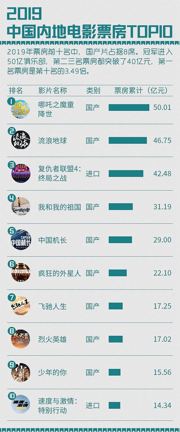 ¡¡¡¡ÔÚµçÓ°°å¿é£¬°×ƤÊéÖ¸³ö£¬2019Äê¹ú²úƬÔÚÆ±·¿ºÍ¿Ú±®ÉÏÓÅÊÆÃ÷ÏÔ£¬Ä򵯮±·¿ÅÅÐаñÅÅÃûǰ10µÄӰƬÖÐÓÐ8²¿¹ú²úƬ¡£ÆäÖУ¬ÅÅÃûǰ4µÄӰƬ¹±Ï×Á˳¬¹ý150Ò򵀮±·¿£¬¼¸ºõÊÇÈ«Äê×ÜÆ±·¿µÄËÄ·ÖÖ®Ò»¡£ÅÅÃûǰ3µÄӰƬ£¬¹ÛÓ°È˴ζ¼ÔÚ1ÒÚ×óÓÒ¡£