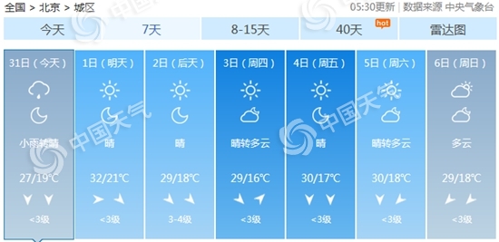 ¡¡¡¡¾ÝÖйúÌìÆøÍøÐÅÏ¢£¬Ô¤¼Æ£¬½ñÌì(8ÔÂ31ÈÕ)Ô糿ÖÁÖÐÎ磬±±¾©ÈÔÓÐСÓêÌìÆø£¬ÖÐÎçǰºó½µÓê½áÊø¡£ÓêÌìÂ·ÃæÊª»¬£¬Äܼû¶È²»¼Ñ£¬¹«ÖÚ³öÐÐÇë×¢Ò⽻ͨ°²È«¡£Ã÷ÆðÖÁÖÜÄ©£¬±±¾©ÒÔÇçÌìºÍ¶àÔÆÎªÖ÷£¬Ò¹¼ä×îµÍÆøÎ¶àÔÚ20¡æÒÔÏ£¬ÔçÍíÁ¹Òâ½¥ÏÔ¡£