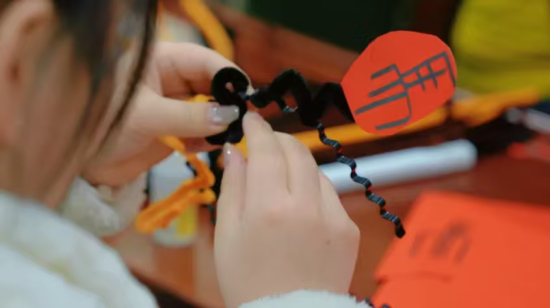 簪花制作环节中,家长与孩子默契协作,将扭扭棒对折缠绕在发箍上,仔细梳理固定。孩子们拿起马克笔,在红色卡纸上尽情创作,有的临摹韩美林笔下的经典马头纹样,有的绘制寓意吉祥的云纹、花卉图案,每一笔都饱含对节日的美好祝福。